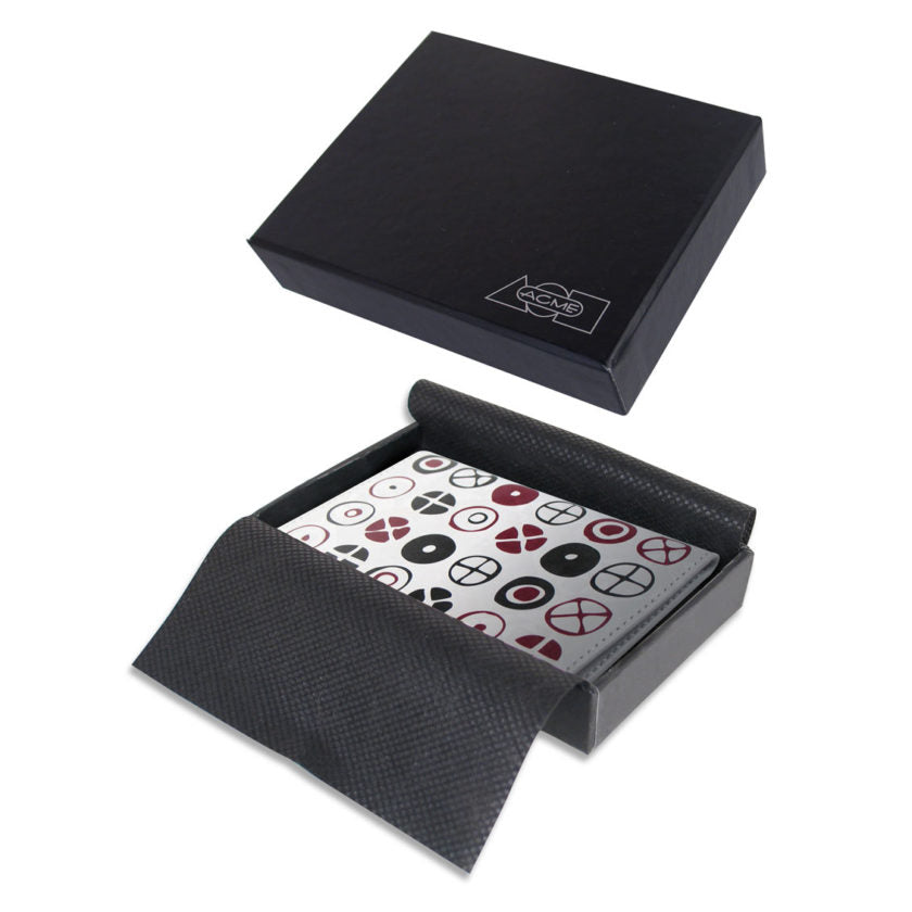Scarlet King Leather Card Case Origin: U.S.A LE11BC “Eames Circles” Leather Card Case, a design by Charles & Ray Eames, comes from ACME Studio’s line of Designer Leather. It is made of the finest leather, which is digitally printed. Leather Card Cases can accommodate business cards, ID, and/or credit cards. The ACME logo is screened on the inside of the wallet. It is packaged in a black ACME box with a black sleeve.
