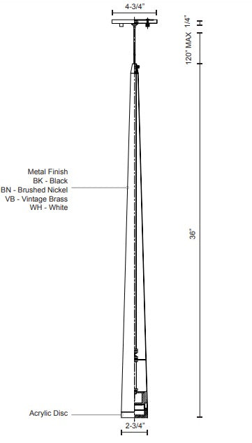 Single LED pendant, sleek conical shape with clear acrylic diffuser. Round canopy equipped with our powerful 120V AC LED technology. LED Rated Life 50,000 hours.