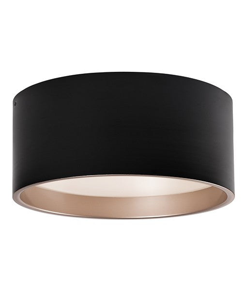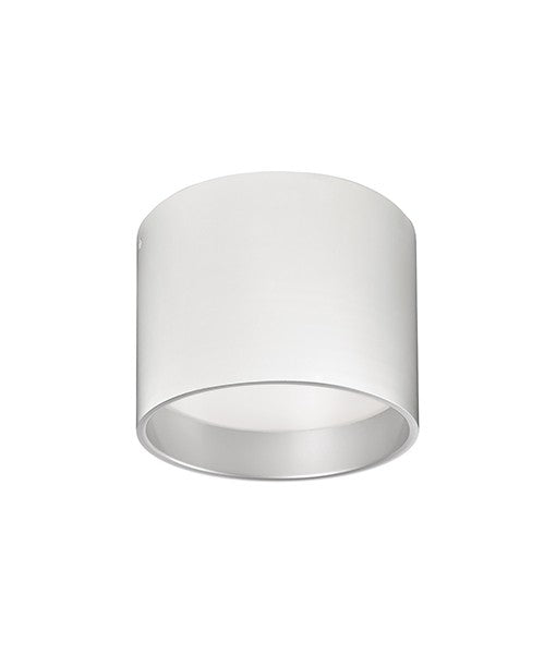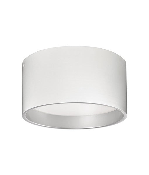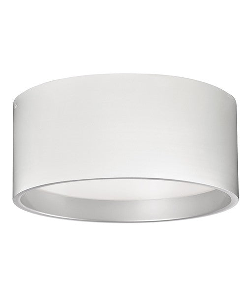 Immaculate in design two toned round cylinder shaped flush mount with white acrylic diffuser. Available in white exterior with sleek silver interior. LED Rated Life 50,000 hours