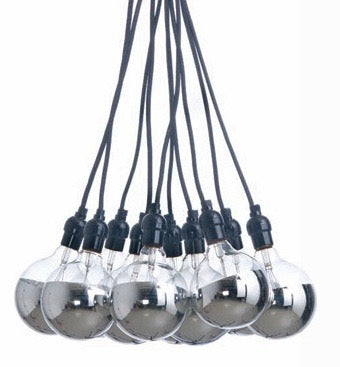 The Ten Tales pendant light features a black cable with black braiding and 10 black bulb socket holders. Takes 10 E26 medium base 25 watt(max) bulbs. Overall diameter varies depending on bulb type used. Bulbs not included.